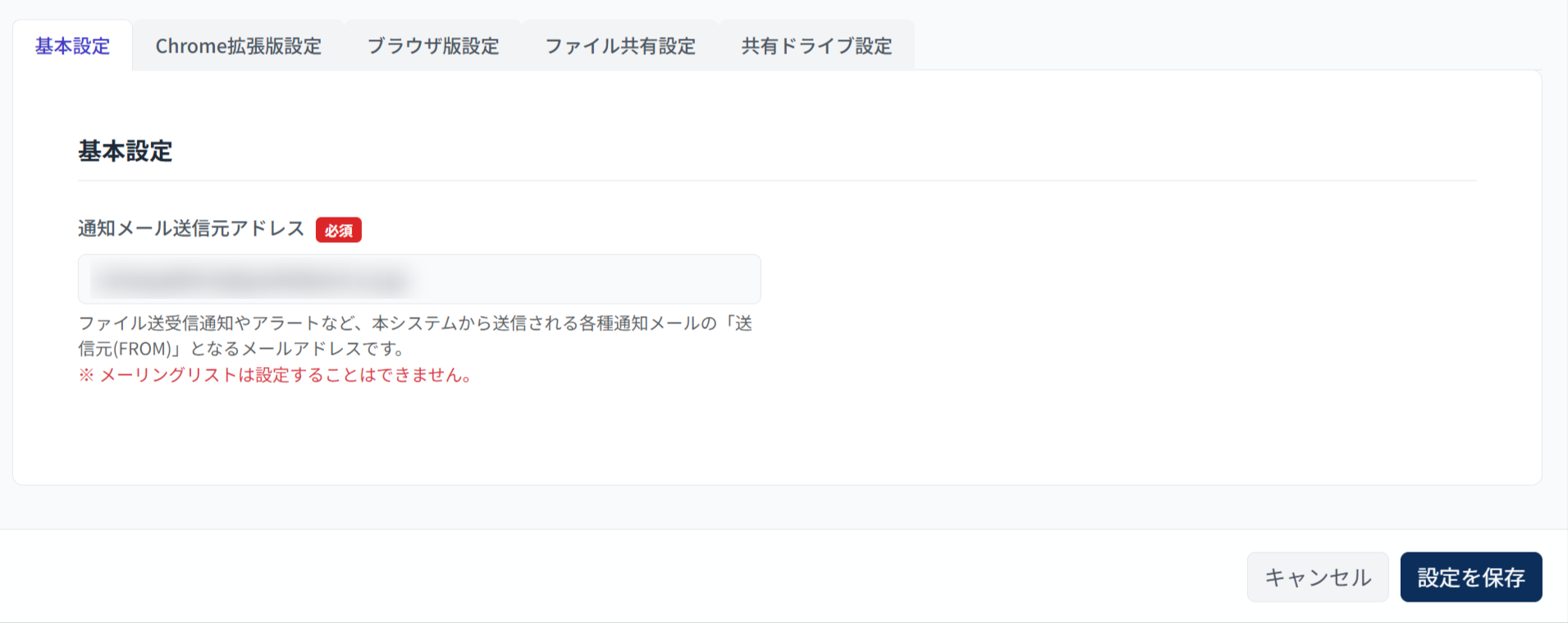 | 通知メール送信元アドレス | 必須 | ファイル送受信通知やアラートなど、Cmosy Pocketから送信される各種通知メールの「送信元(FROM)」となるメールアドレスです。 ※ドメイン内のメールアドレスをご指定ください。 ※メーリングリスト(グループアドレス)は指定できません。 |