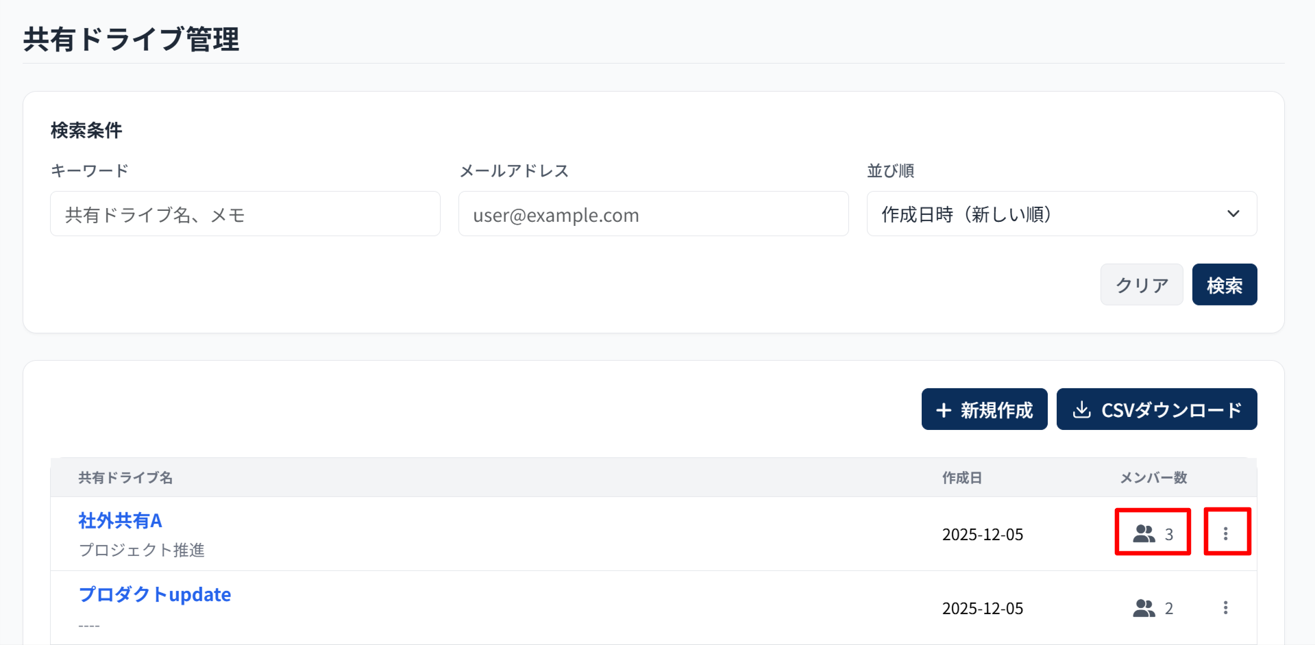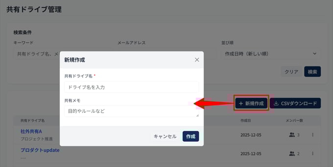 共有ドライブ名、メモの内容、メールアドレスによる絞り込みが可能です。また、作成日時や名前順での並べ替え(ソート)も行えます。