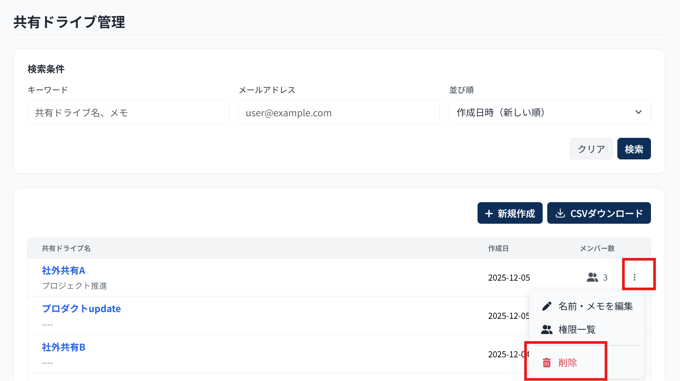 検索条件で絞り込んだ共有ドライブの情報を、CSV形式で一括ダウンロードできます。