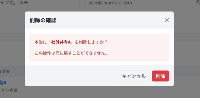 - 確認ダイアログが表示されるので、内容を確認し[削除] を押下します。