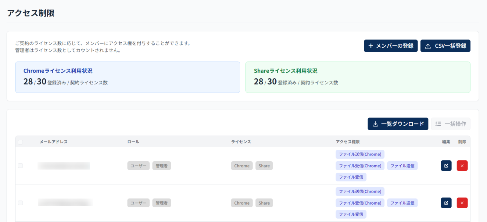 | アクセス権限 | 「ファイル送信」「ファイル受信」など、アクセスできる機能が権限が表示されます。 |