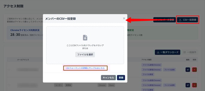 - 指定のフォーマットに従ったCSVファイルをアップロードすることで、複数のユーザーを一度に登録できます。