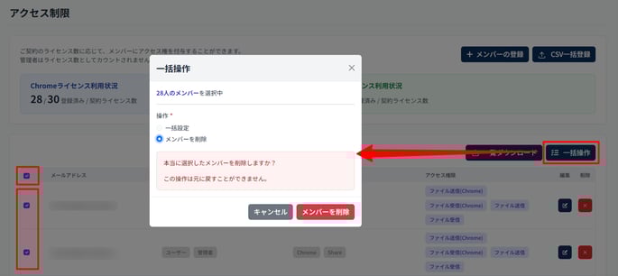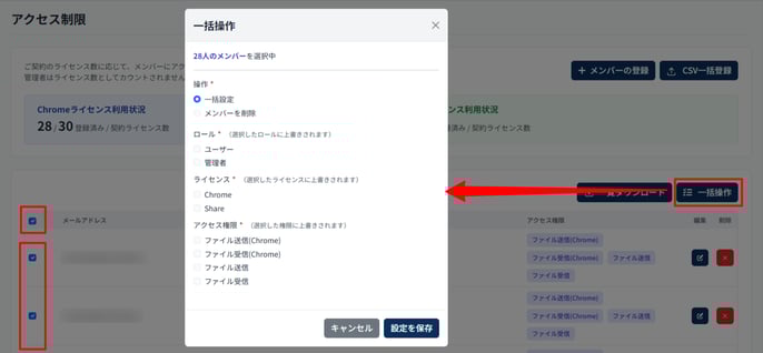 上部のチェックを入れると、メンバーの全選択ができます。 - 選択した状態で [一括操作] を押下します。