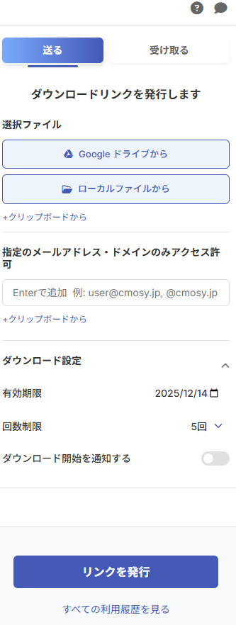 社外のユーザーにファイルを安全に送るための機能です。Chrome拡張機能の専用アプリ上で、ダウンロード回数、有効期限等の制限をかけたダウンロードリンクを発行できます。