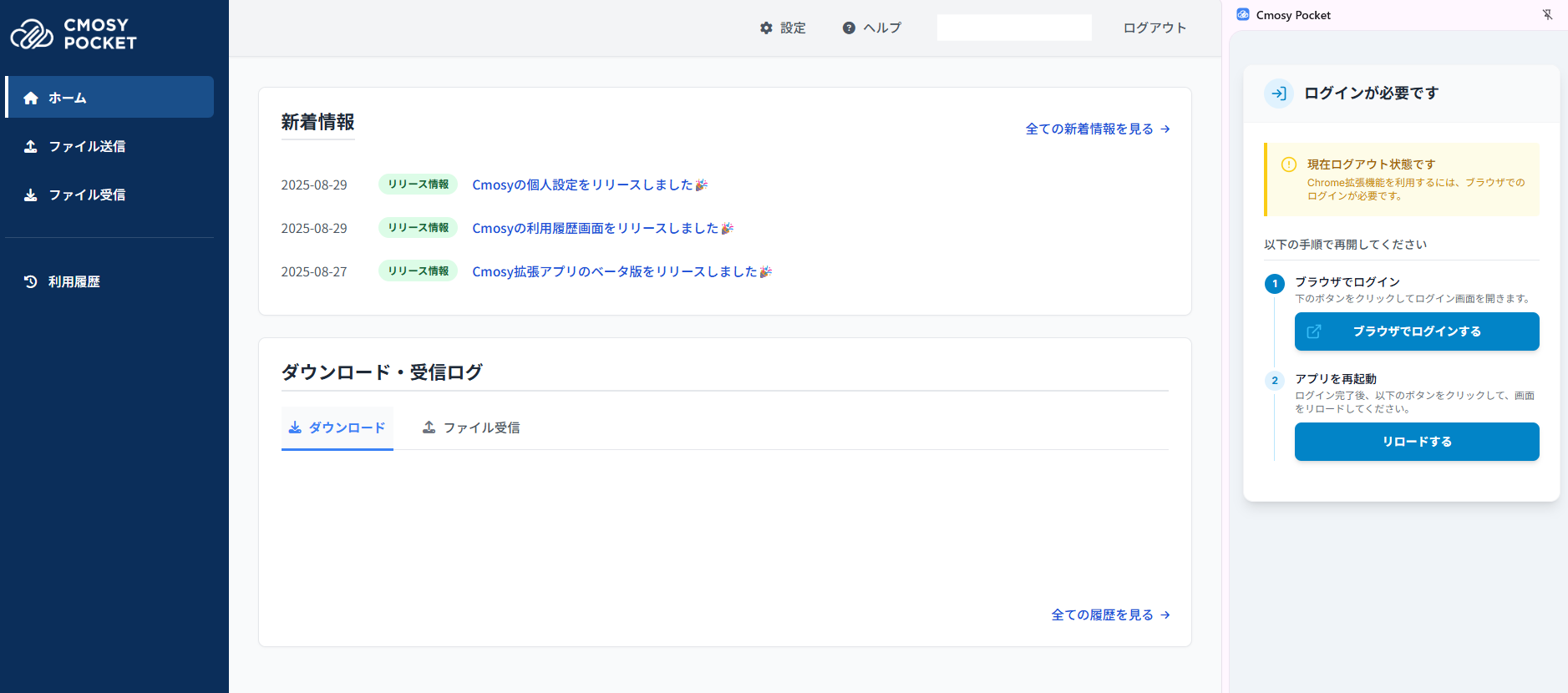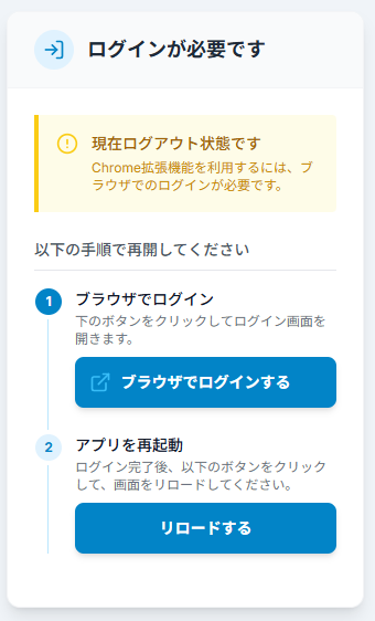 Chromeブラウザの拡張機能アイコンをクリックした際に、ログアウト状態だと、左画面が表示され、ログインが案内されます。