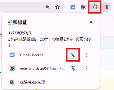 - 拡張機能を頻繁に利用する場合、ワンクリックで起動できるようにツールバーに固定(ピン留め)することをお勧めします。